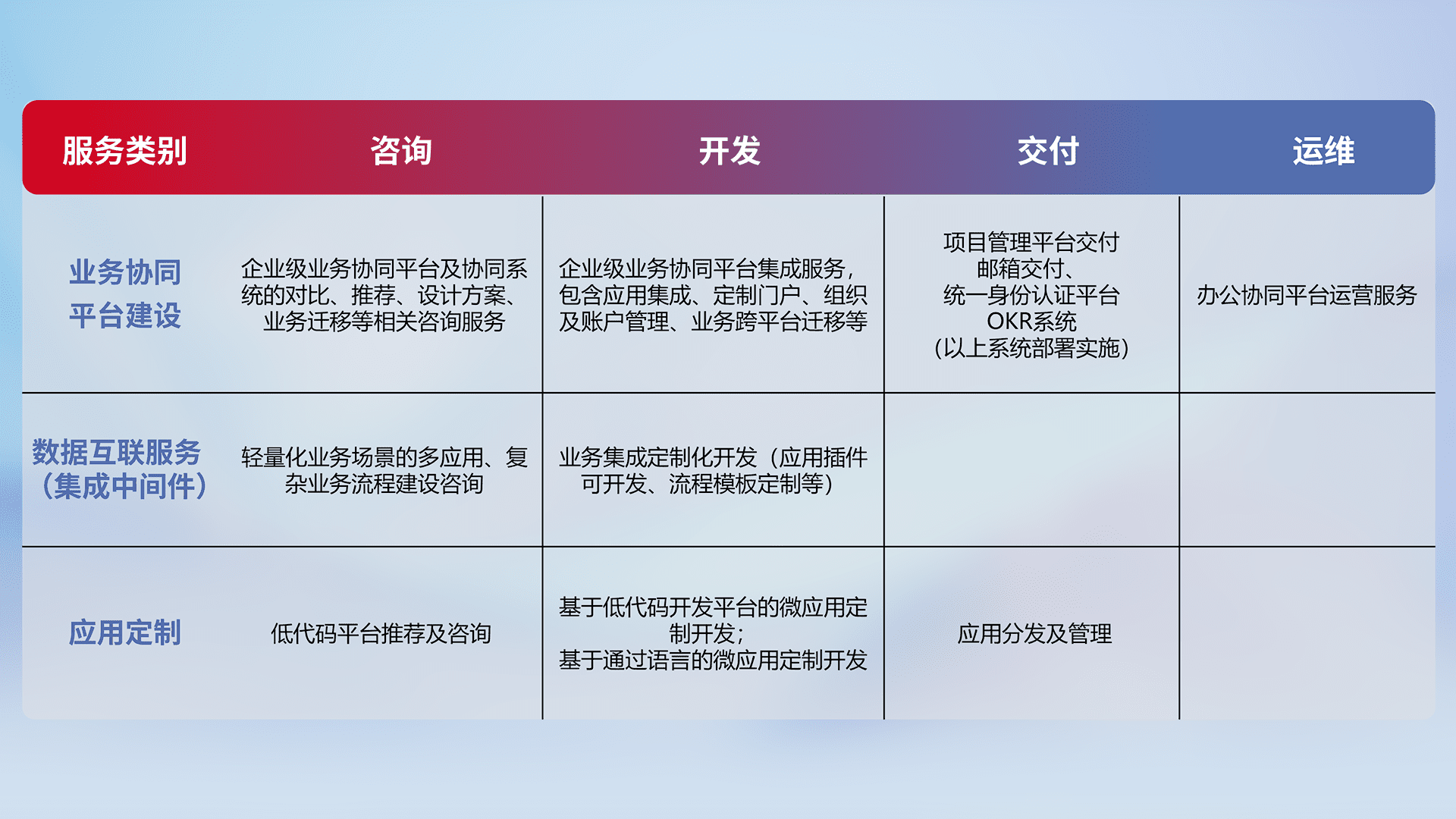 针对钉钉、、企微、、IDaas等平台级产品提供产品的规划、、方案、、、交付、、、定制化开发等服务,,,实现如统一协同办公、、、、智能客户服务、、混合会议管理、、、、智能数据查询、、、等业务场景,,,实现数字化转型。。