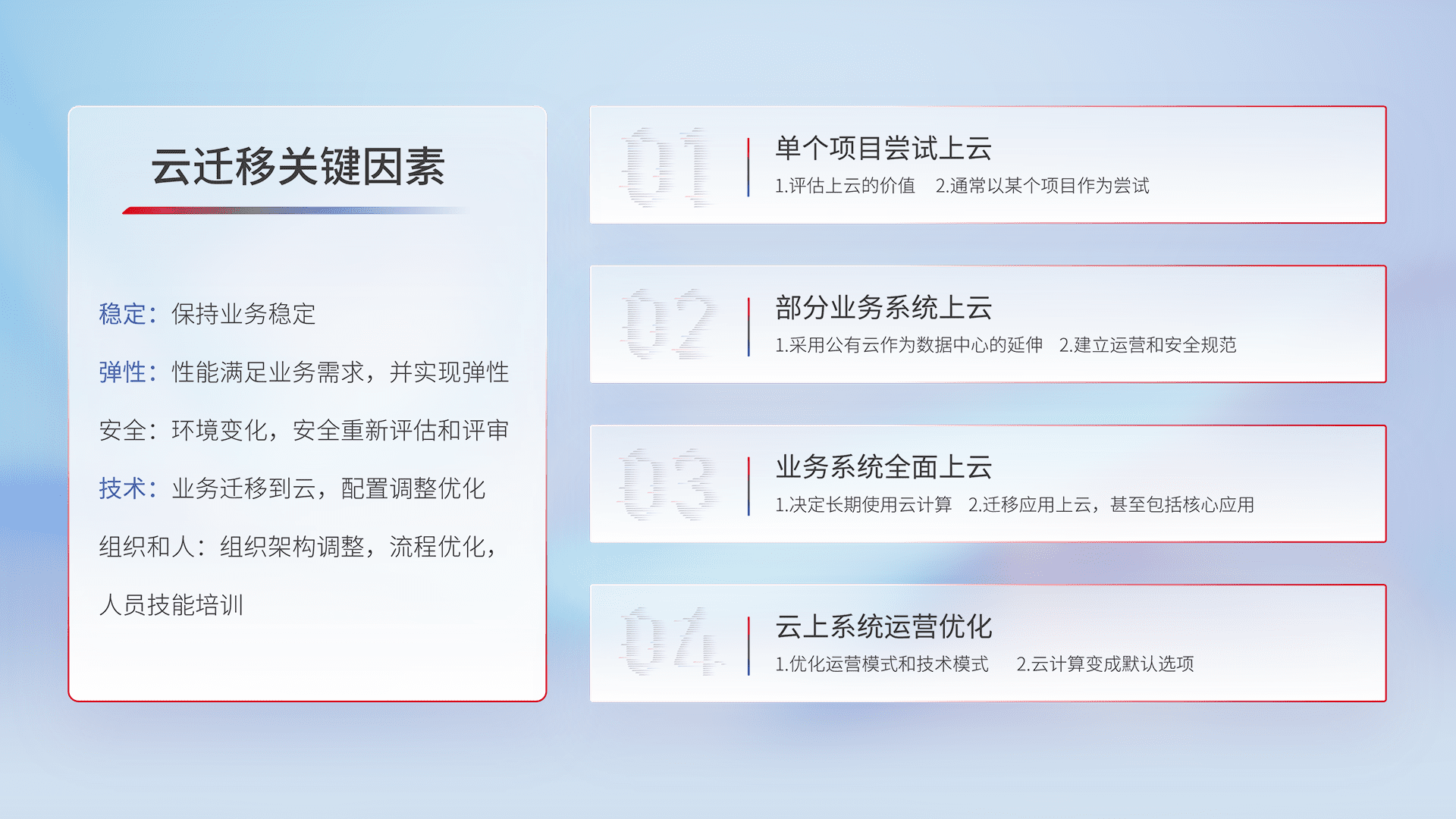 结合实际业务,,,从规划设计、、云平台选型、、云原生改造、、、、数据迁移、、、集成交付,,迁移全过程为客户识别最佳上云路径,,,做好风险识别管理,,设计网络架构、、、身份权限、、安全审计合规、、、操作审计、、、日志审计、、监控告警策略、、、多站点容灾设计等,,,,对云上基础设施进行整体规划,,提升IT治理水平,,,,以满足弹性、、、高可用、、、高性能的需求。。。