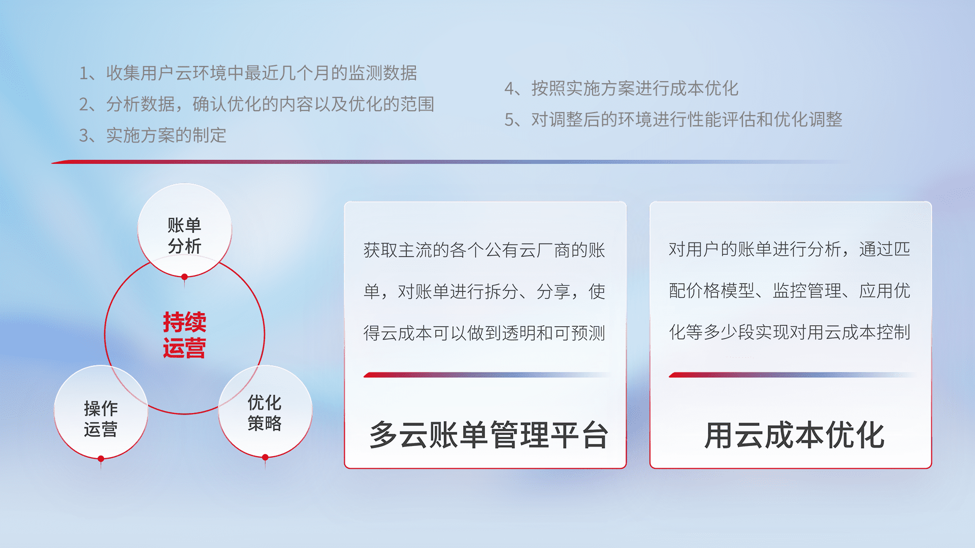 通过多云纳管,,,,以统一的资源数据模型把客户的云资源进行抽象和封装,,,,进而实现对多云资源的统一操作,,,,保障云资源管理的可靠性、、稳定性与可用性。。。量身定制化运维内容,,,配置、、、、开发运维、、补丁管理、、、备份、、、、监控、、、认证和访问管理、、、审计和日常巡检等,,,,保障在用云过程中的可靠度,,,稳定度以及高可用率。。